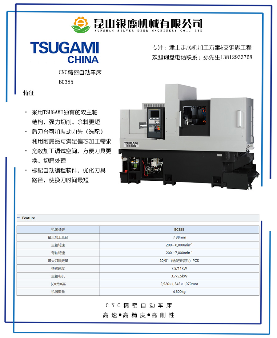 津上目前在產(chǎn)最大直徑之走心機(jī),適用直徑8-38mm,主軸7.5-11KW電機(jī),背軸3.7/5.5KW,配套剛性高。對長軸類大直徑產(chǎn)品實(shí)現(xiàn)自動(dòng)化批量加工。機(jī)床整體重達(dá)4600kg;比較專業(yè)細(xì)節(jié)的部分,面談。
