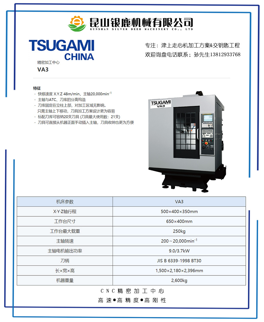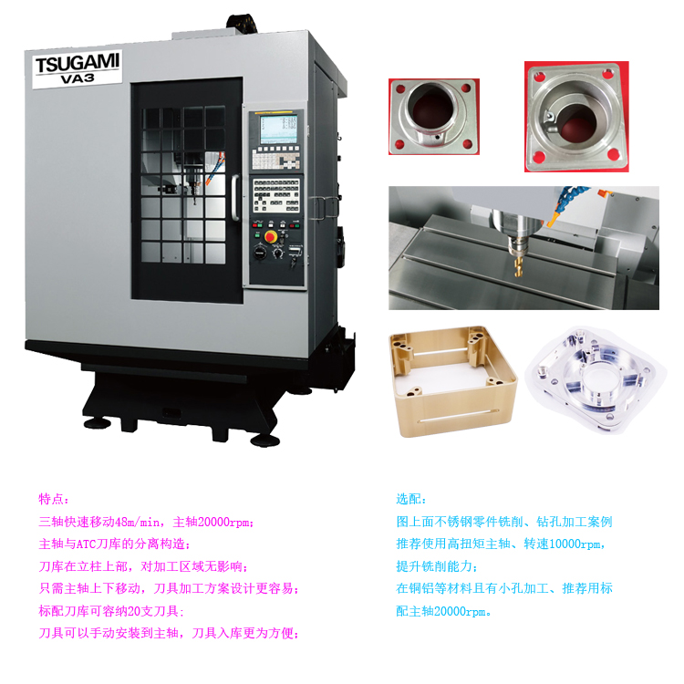 日本津上秉持專(zhuān)業(yè)開(kāi)拓的鉆攻中心系列,刀臂式刀庫(kù)20刀位,BT30主軸20000rpm,主軸功率3.7/9KW,三軸快移48m/min,高速換刀0.8秒(刀到刀),工作臺(tái)650*400mm,可最大承重250kg。