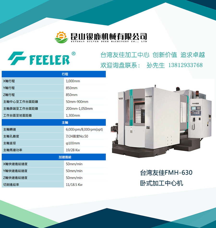 臺灣友嘉FMH-630雙臺面臥式加工中心,設(shè)計(jì)理念在高效率、穩(wěn)定、重切削之具體表現(xiàn)??梢猿薪幽>?、大型工件加工。針對一般精密工件或是模具加工,都可勝任。穩(wěn)固高剛性結(jié)構(gòu),特殊高低軌設(shè)計(jì),底座采用T型一體式三層箱形結(jié)構(gòu)設(shè)計(jì),配合鑄件內(nèi)部優(yōu)化的肋骨強(qiáng)化,發(fā)揮機(jī)械剛性與穩(wěn)定性;門型雙重壁之立柱結(jié)構(gòu),剛性穩(wěn)固,保證重切削之需;底座采用高低軌設(shè)計(jì),有效縮短力流線,并且提高加工穩(wěn)定性。工作臺配置大錐面托板定位拉栓,定位精密、保證加工精度。配備旋轉(zhuǎn)式自動交換工作臺,最大荷重1200KG,工作臺最大直徑950mm,最快交換速度10秒。鏈條式刀庫,60、80、90、120刀位備選。